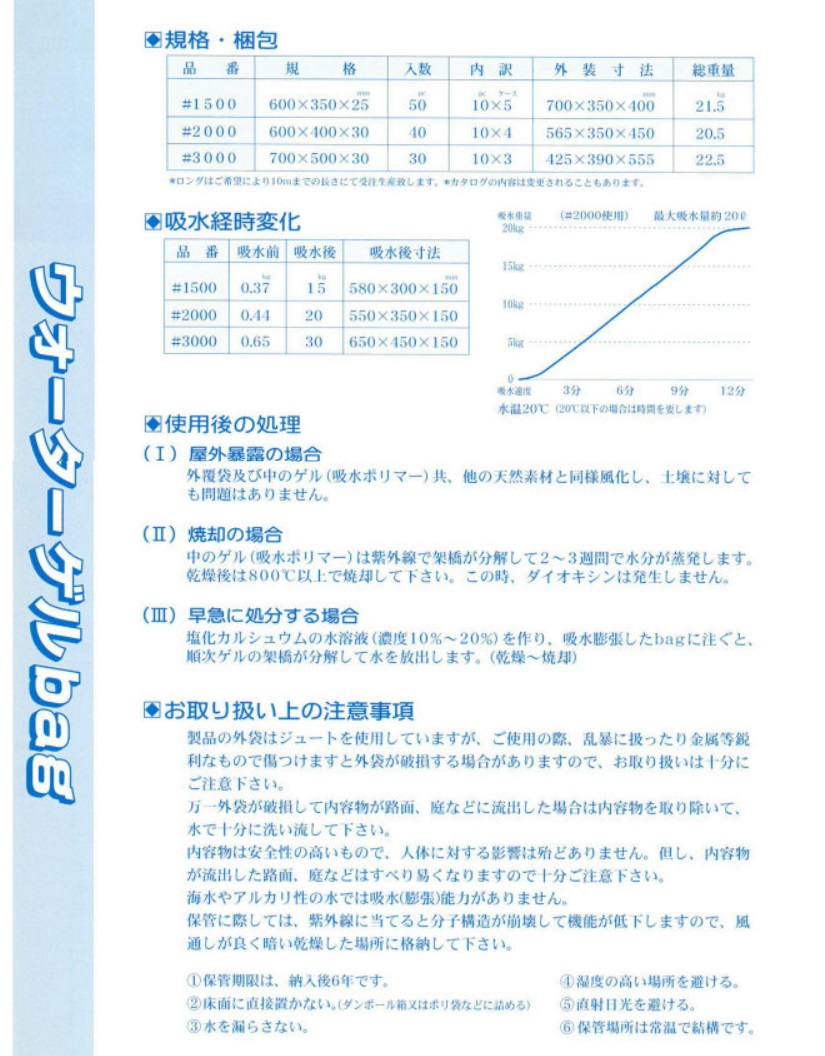 ・外覆袋及び中のゲル(吸水ポリマー)共、他の天然素材と同様風化し、土壌に対しても問題はありません。