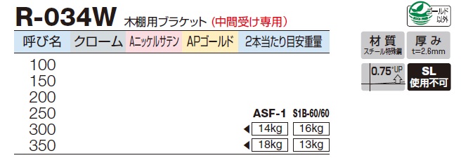 ロイヤル 木棚用ブラケット R-034W L=300mm【クローム】 (1本)