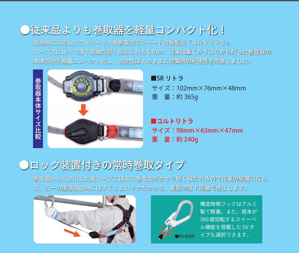 <軽量・小型巻取式ランヤード!【藤井電工 新規格 墜落制止用器具 安全帯ツヨロン ハーネス用ツインランヤード コルトリトラ 小型・軽量 THL-2-CR93SV-21KS-2R23 】>