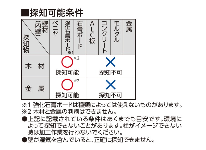 ●壁材がベニヤ、強化石膏ボード(種類によっては使えないものがあります。)、石膏ボードの時に木材と金属を探知可能(木材と金属の判別はできません。)