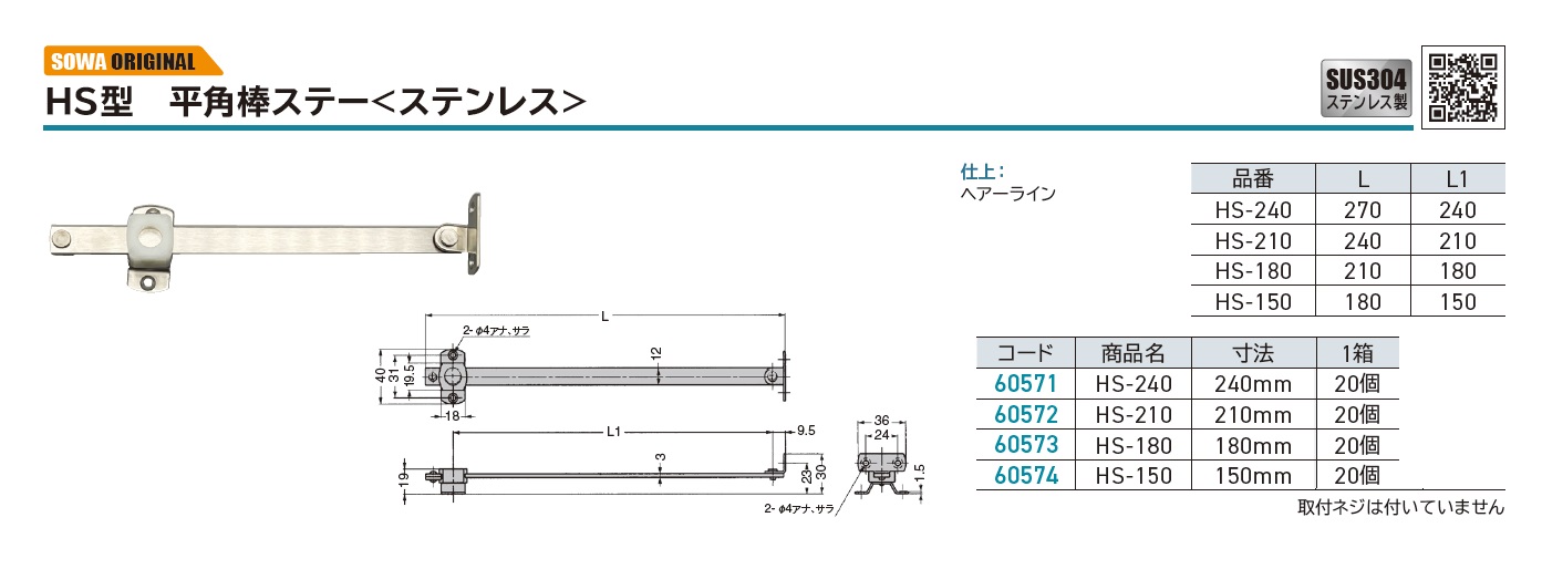 商品名: SOWA ステン平角棒ステー HS-240・HS-210・HS-180・HS-150・60571・60572・60573・60574・