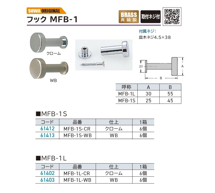 商品名: SOWA 真鍮フック MFB-1 MFB-1S-CR・MFB-1S-WB・MFB-1L-CR・MFB-1L-WB 61412・61413・61402・61403