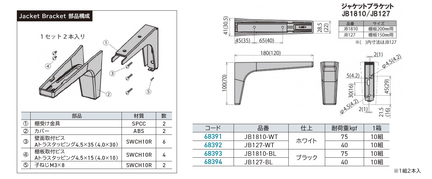 商品名: SOWA 樹脂カバー付き棚受[ジャケットブラケット] JB1810-WT・JB127-WT・JB1810-BL・JB127-BL 68391・68392・68393・68394
