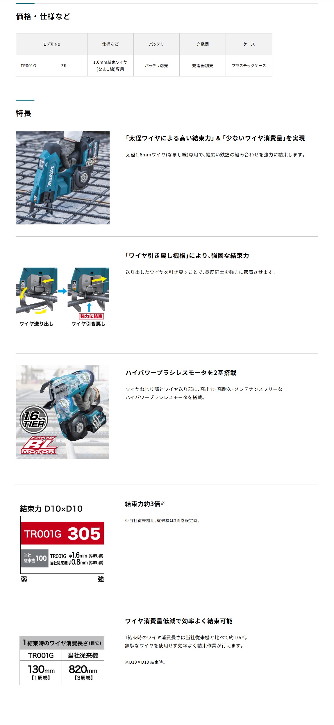 <1.6mmワイヤで高い結束力、消費量を低減!「ワイヤ引き戻し機構」搭載で強力結束【マキタ 充電式鉄筋結束機 TR001GZK】>