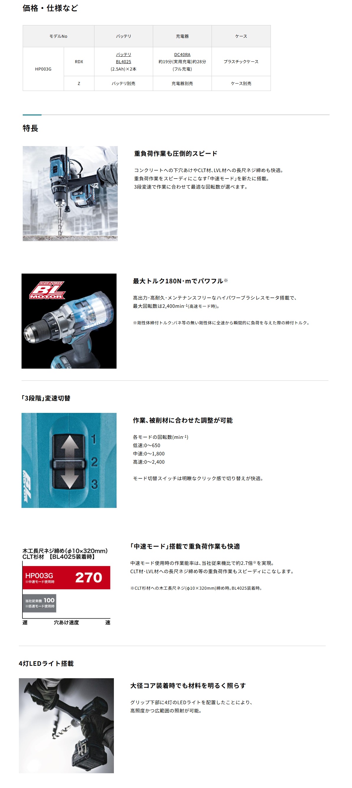 <最大トルク180N・m & 「中速モード」搭載!長尺ネジ締め等の重負荷作業もスピーディ!コンクリート穴あけ20mmまで対応!【マキタ 充電式震動ドライバドリル HP003GRDX・HP003GZ】>