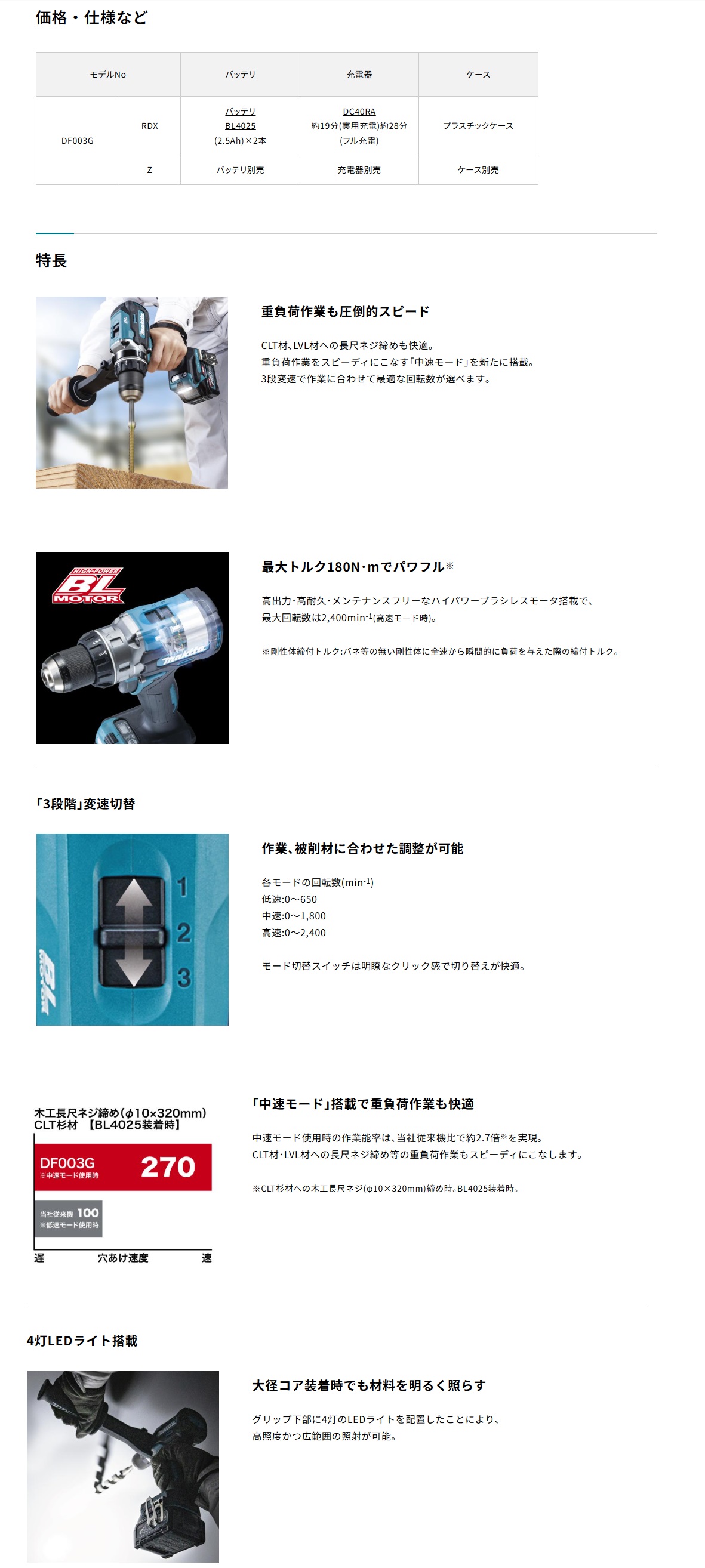 <最大トルク180N・m & 「中速モード」搭載!長尺ネジ締め等の重負荷作業もスピーディ!【マキタ 充電式ドライバドリル DF003GRDX・DF003GZ】>