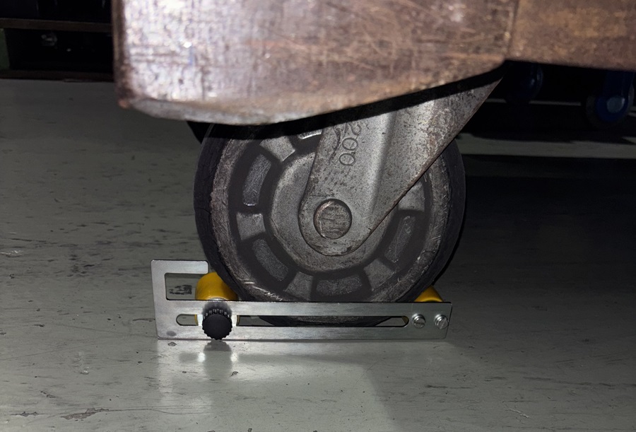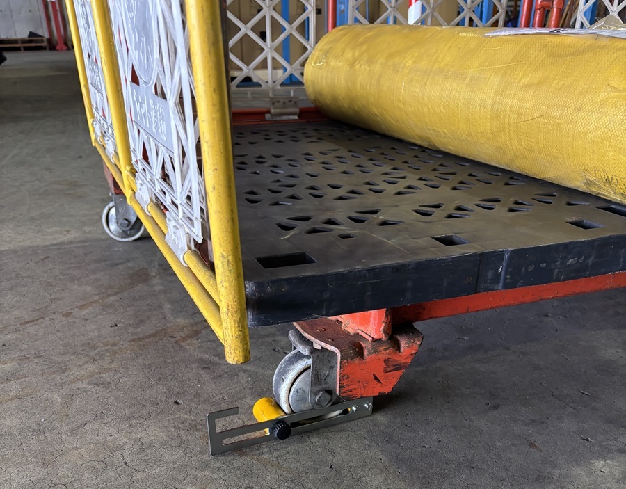 ●台車の車輪部に、工具不要で「後付けできる」簡易ストッパーです。