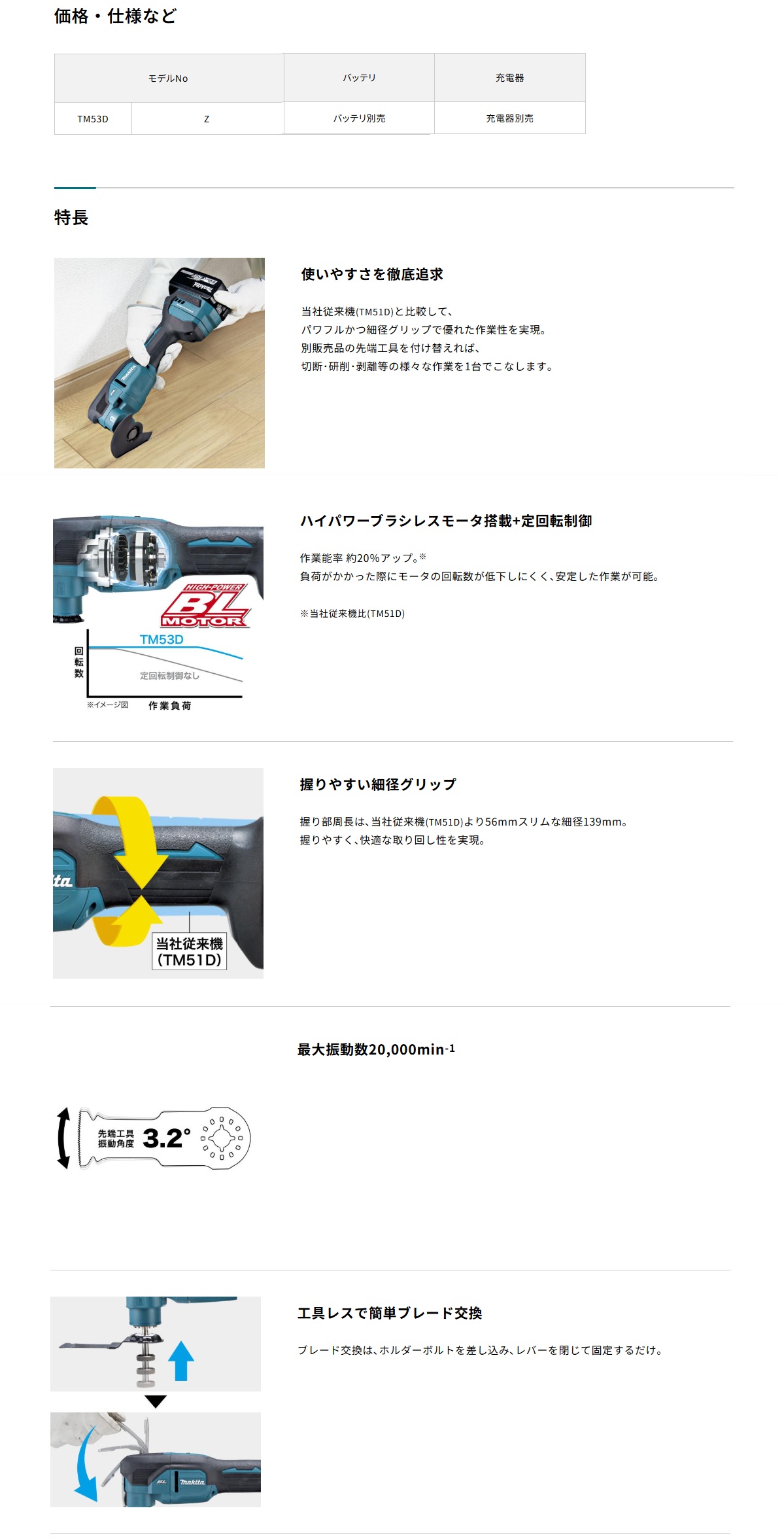 <使いやすさを徹底追求!パワフル&細径ボディで優れた作業性【マキタ 充電式マルチツール TM53DZ】>