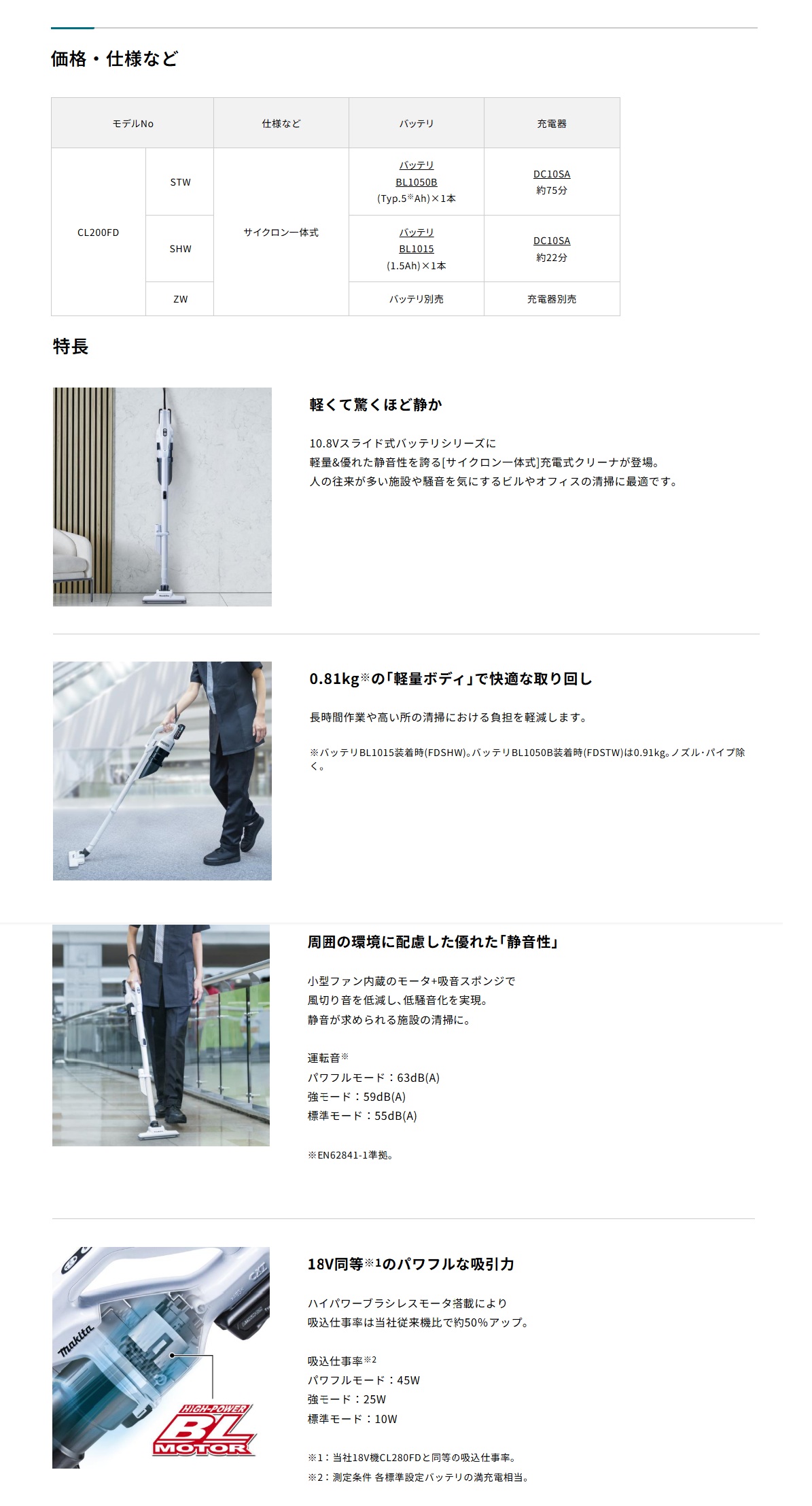 <軽くて驚くほど静か!パワフルな18V同等※の吸引力&サイクロン一体式【マキタ 充電式クリーナ CL200FDSTW・CL200FDSHW・CL200FDZW】>