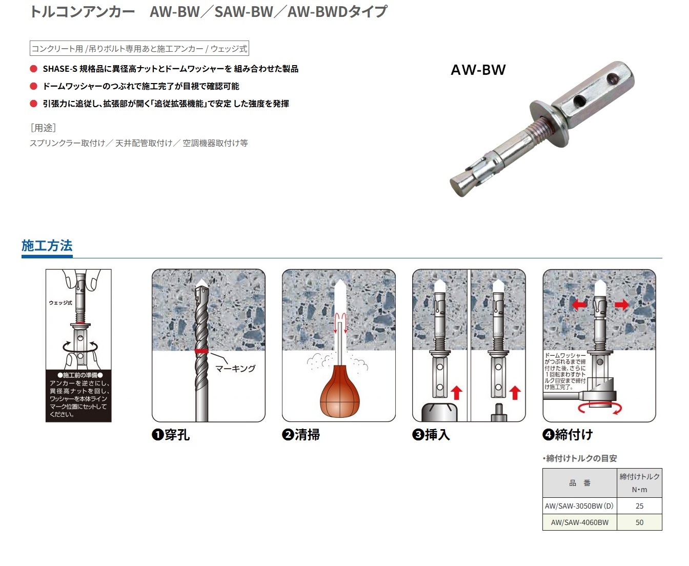 <コンクリート用 /吊りボルト専用あと施工アンカー / ウェッジ式【サンコーテクノ トルコンアンカー AW-BW/SAW-BW/AW-BWDタイプ】>