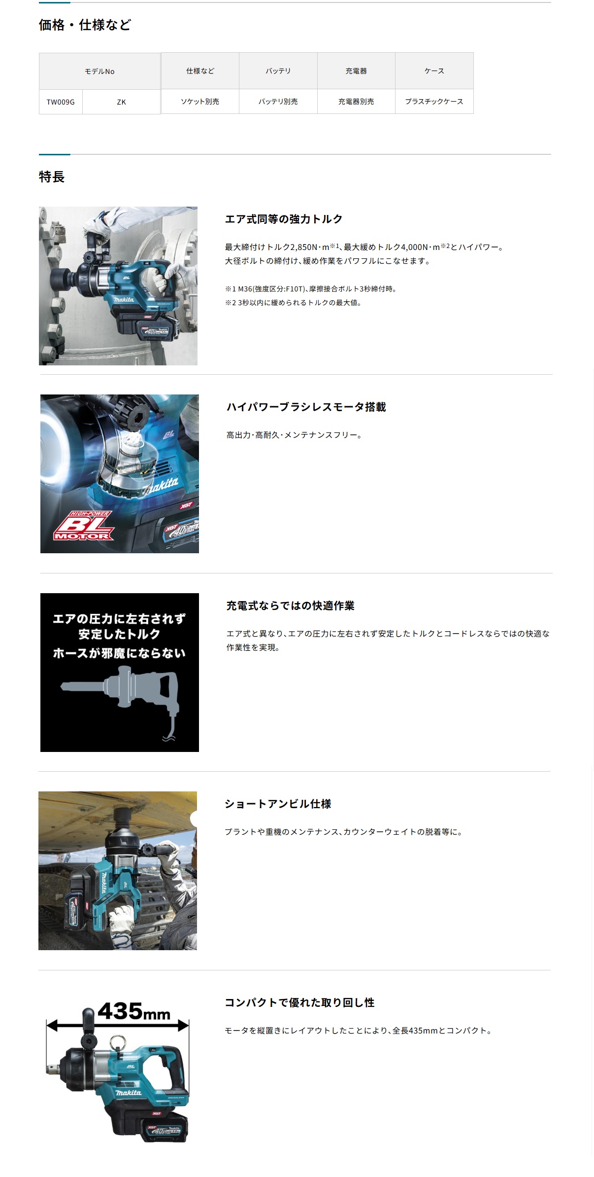 <エア式同等の強力トルク!ショートアンビル仕様でプラントや重機のメンテナンス等に最適!【マキタ 充電式インパクトレンチ TW009GZK】>